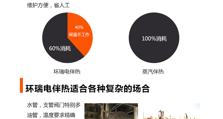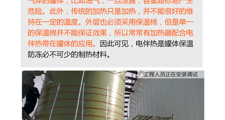 所以,罐體不僅要防凍保溫,仍需要加熱。據(jù)此,可選擇不同的電伴熱種類,予以實現(xiàn),它不用接觸罐體的介質(zhì),只靠熱量的傳遞,達到保溫加熱的效果。