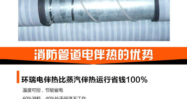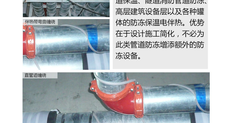 消防管道與人們的生活息息相關(guān),電伴作為一種有效的消防管道防凍解決方案,在消防管線及地下車庫(kù)噴淋系統(tǒng)中,一直被廣泛應(yīng)用,其工作原理是通過(guò)電熱帶散發(fā)的熱量,間接或直接的熱交換補(bǔ)償被伴熱管道的熱損失,以達(dá)到防凍保溫的要求,保證消防管道在嚴(yán)寒的冬季正常使用。我公司消防管道專用防凍電伴熱,具有使用壽命長(zhǎng)、啟動(dòng)電流小、記憶性能好、年衰減率低等優(yōu)點(diǎn)。