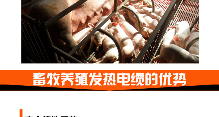 發(fā)熱電纜廣泛應(yīng)用于養(yǎng)殖場(chǎng)分娩舍、保育舍的采暖,高質(zhì)量的發(fā)熱電纜產(chǎn)品,使用非常安全可靠,避免了極冷冬天因天氣寒冷造成的乳、幼豬凍傷、凍死事故發(fā)生以及傳統(tǒng)的紅外線燈加熱溫度過高帶來的灼傷。相對(duì)于傳統(tǒng)的采暖,環(huán)瑞發(fā)熱電纜具備很好的優(yōu)勢(shì)。